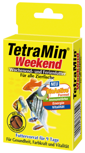 TetraMin Weekend Вас длительное время нет дома - пищевые палочки TetraMin Weekend прекрасно справятся с кормлением рыбок. - высокое содержание жизненно важных минеральных веществ и белков - оптимальная пропорция жиров и углеводов - уникальный производственный процесс позволяет получить жесткий корм, не содержащий трудно усваиваемых вяжущих веществ - плотные пищевые палочки легко дозировать в соответствии с объемом воды и числом рыбок. Их хватает на 9 дней! - они не портятся и не ухудшают показателей воды - удобная дозировка, соответствующая объёму аквариумной воды и количеству рыбок - с запатентованной* формулой BioActive- для продолжительной и здоровой жизни Ваших питомцев * EP 0848592