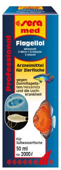 Аквариумисты, кто держит дискусов и других больших циклид, знают проблему: Повреждения в области головы из которых выделяется слизистая беловатая никротизированная ткань, известные как болезнь <углублений в голове>. Причина этих очевидных признаков: жгутиконосцы родов Spironucleus и Hexamita, живущие в кишечниках.Теперь у аквариумистов есть под рукой очень эффективное средство против этих опасных болезнетворных микроорганизмов: SERA med Professional Флагеллол. Он очень хорошо воспринимается рыбами и не только безопасно и надежно удаляет всех паразитов из кишечника рыбы, но также и их покоящиеся стадии (цисты).Предпосылка: Новая комбинация биологически активных веществ связывает тиазол и менадион, известный как витамин K3. Ученые из Хайнсберга/Германия выяснили, что эта комбинация гарантирует значительно лучшие результаты, чем применение этих веществ по одиночке – при комбинировании действие этих веществ взаимно усиливается. Жгутиконосцы будут надежно уничтожены только приблизительно спустя 24 часа с момента начала обработки. Патент на новую комбинацию биологически активных веществ уже регистрируется.SERA med Professional Флагеллол - жидкость и поэтому может дозироваться легко и точно.