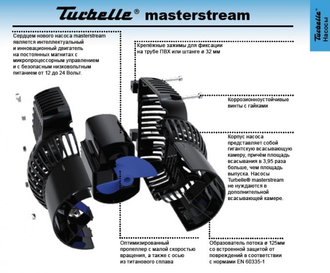 Turbelle® masterstream представляют собой насосы с электронным управлением числом оборотов с безопасным низковольтным напряжением от 12 до 24В. Они идеально подходят для использования при организации циркуляции воды, прибоя или имитации отливов и приливов.