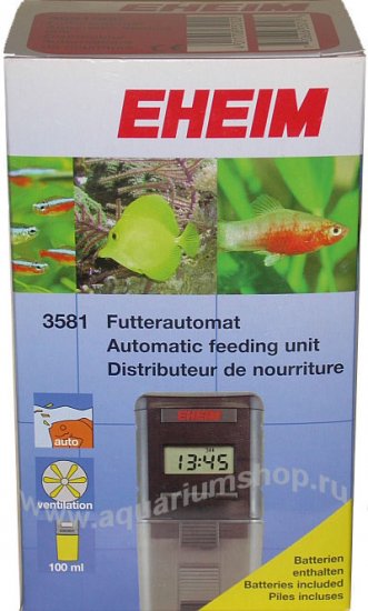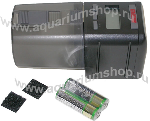 Автоматическая кормушка EHEIM поставляется в комплекте с батарейками (тип АА). Принудительно вентилируемая ёмкость для корма сохраняет сухим корм вплоть до последней гранулы. Простое и понятное программирование помогает решить, когда Вам "пригласить к столу" ваших обитателей аквариума. Повторные (двойные) дозировки корма также предусмотрены в программировании. Простым нажатием клавиши в любое время возможно кормление в промежутке между запрограммированными приемами пищи. Система предупреждения информирует Вас своевременно о замене батарейки. Ёмкость контейнера для корма приблизительно 100 мл.