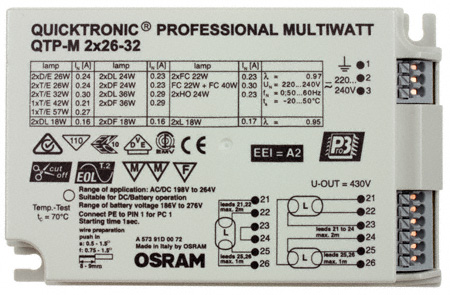 OSRAM QUICKTRONIC MULTIWATT QTP-M 2x26-32/230-240 S (2xL18W 2xDL18/24/36W 2xHO24W) (123x79x33) ЭПРА