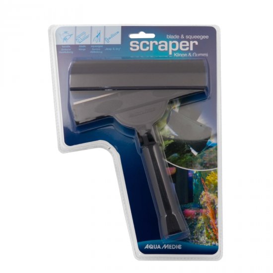 Aqua Medic Scraper представляет собой многофункциональный скребок для стёкол. Лезвия шириной 15 см изготавливаются из специальной стали, устойчивой к коррозии, и позволяют легко удалять с аквариумного стекла даже твердый налет известковых водорослей. Съёмный чехол для лезвий оснащён резиновой вставкой для очистки аквариумного стекла снаружи. Однако изюминкой скребка является шарнир, позволяющий поворачивать лезвия на 180 градусов и чистить стёкла, почти полностью закрытые скалами или декорациями.