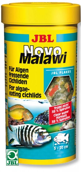 Корм JBL NovoMalawi содержит ценные водоросли (Spirulina platensis), растительное сырьё и клетчатку, и, кроме того, небольшой процент животного белка, который специально добавляется в соответствии с питательными потребностями цихлид-водорослеедов из озёр Малави и Танганьика. При объедании водорослевых зарослей эти рыбы регулярно заглатывают и микроскопически малых животных. Ценные каротиноиды поддерживают яркую окраску рыб. Сбалансированная смесь всех важных питательных элементов: белков, жиров и углеводов, а также жизненно необходимых минералов и витаминов обеспечивают здоровый рост, повышают устойчивость к заболеваниям.