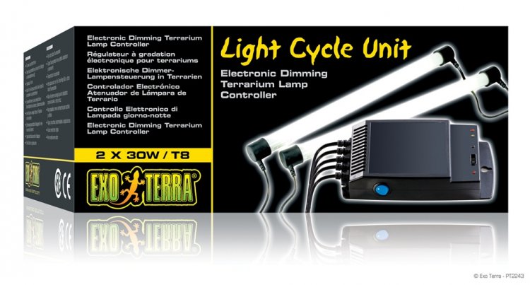HAGEN Exo Terra Light Cycle - это стартер, контролер с диммером, электронный балласт, таймер и имитатор рассвета-заката в одном устройстве. Таймер может быть установлен на три периода: 10, 12 или 14 часов. Когда начинается дневной цикл, свет плавно загорается в течении получаса, имитируя естественный рассвет. В конце каждого светового периода "закат" занимает тоже около получаса. Это меньший стресс для террариумных животных и стимулирует размножение и естественное поведение у многих видов рептилий. Это дает животным, и дневным и ночным, время для того, чтобы скрыться в норах или убежищах. HAGEN Exo Terra Light Cycle - это гибкое решение для освещения вашего террариума. Достаточно закрепить балласт неподалеку от террариума, и подсоединить водозащитные колпаки к разъемам люминисцентных ламп. Длинные гибкие провда позволят вам разместить лампы очень близко к животным, что необходимо при использовании ультрафиолетовых ламп (например, Repti Glo 5.0 или 10.0). То, что провода подключения ламп большей длины, также позволяет разместить балласт снаружи террариума на удалении от него и использовать его в любом террариуме.