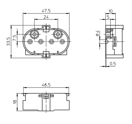 2G11 накладной патронКорпус: PBT GF, белый, T140, номинальный режим: 2/500Двойные безвинтовые контактные зажимы:0,5–1 мм2 (цепь лампы)безвинтовые контактные зажимы:0,5–1 мм2 (цепь стартера)Боковые оси для кронштейна 105824 (см.стр. 190)Установочные отверстия с тыльной стороны для саморезов по ISO 1481/7049-ST4,2-C/FПередние установочные отверстия для винтов M3Вес: 12,7 гТип: 36051