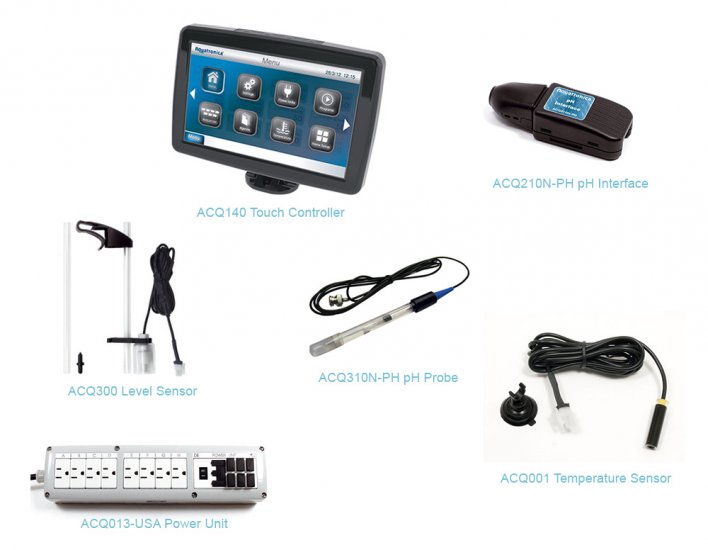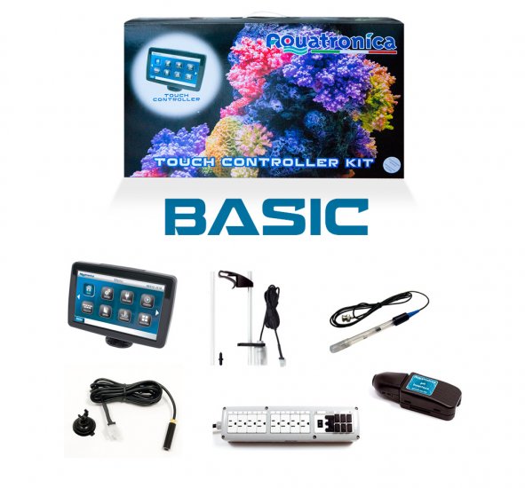 Aquatronica Touch Controller 7”display BASIC KIT Сенсорный Аквакомпьютер с цветным 7 дюйм дисплеем Базовый Набор Плюс 5 комплектующих.BASIC KIT/Базовый Набор Плюс 5 комплектующих1. Aquatronica Power Unit 6 Plug with I/O USB Блок из 6-и управл. розеток 44.7x6.5x8.2см 230В2.3 Aquatronica pH Interface Интерфейс для рН электрода + рН Electrode рН электрод, предел измерений от 0 до 14pH4. Aquatronica Temperature sensor Температурный сенсор5. Aquatronica Water presence sensor Датчик уровня водыАквакомпьютер Touch Controller 7”display BASIC KITот AQUATRONICA является инновационным и привлекательным электронным устройством с 7 дюймовым сенсорным дисплеем. Всё управление, настройки и контроль теперь можно совершать в одном устройстве. Интерфейс создан дизайнерами интуитивно понятным. Вам станут доступны наглядные результаты от измерения параметров воды в виде графиков, широкие возможности подключения перефирийных устройств таких, как разные виды помп, освещение, охлаждение/нагрев и тд. В зависимости от личных предпочтений Аквакомпьютер позволяет связать текущие параметры воды и работу периферийных устройств. Подключение к интернету осуществляется через встроенный интернет модуль (просто воткнуть кабель с инетом). Для Wi-Fi потребуется модем. Сетевые параметры имеют настройки для просмотра и управлением удалённо через интернет. Информацию о текущем состоянии аквариума можно получать на электронную почту. Система совместима с Windows и Apple.Общий обзор Аквакомпьютер Touch Controller 7”display BASIC KITот AQUATRONICA Правда, на итальянском, но для общего представления будет интересно. Арт: ACQKIT140-EU