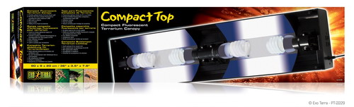 Светильник для террариумов Compact Top создан специально для более удобного использования ламп Repti Glo Compact Компактный светильник для флуоресцентных ламп, устанавливаемый на крышу террариума Пригоден для ламп флуоресцентных и ламп накаливания Exo Terra (максимум 26 Вт). Имеет встроенный отражатель. Предельно прост в установке. Оснащен специальным желобком для установки дополнительных аксессуаров. Светильники Exo Terra Compact Top Canopy – компактные плафонные светильники для флуоресцентных ламп, разработанные для использования в стеклянных террариумах Exo Terra. Эти легко устанавливаемые светильники могут быть оснащены компактными флуоресцентными лампами или лампами накаливания небольшой мощности. Комбинация двух разных компактных флуоресцентных ламп Exo Terra Repti Glo (PT-2226-2227) для создания идеального соотношения ультрафиолетового и видимого света, а использование в качестве источника света лампы накаливания, такой как Exo Terra Sun Glo, позволит повысить общую температуру воздуха в террариуме. Дополнительные аксессуары Exo Terra, такие как цифровые термометр и гигрометр, а также термостат и гигростат, могут быть установлены в специальный желоб на верхней стороне светильника