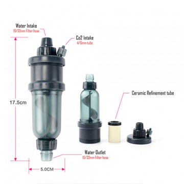 Реактор СО2 с керамическим диффузором для внешних фильтров - простой монтаж с канистровым фильтром (внутренний диаметр шланга должен быть 16 мм). Встроенный керамический распылитель создаёт мельчайшие пузырьки. Легко разбирается для удобства очистки. Высокий процент растворения, бесшумная работа, не уменьшает прокачку фильтра. Надёжное крепление для шлангов.