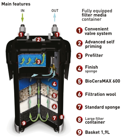 Беспрецедентная производительность: устройство отличается очень большой пропускной способностью (максимальные значения от 1000 до 2000 л/ч), благодаря чему они могут эффективно работать даже в очень больших аквариумах (объёмом до 700 л). Более того, они очень вместительны и содержат значительное количество фильтрующих наполнителей, помещённых в удобные, эргономичные корзинки объемом 1,9 л каждая (в зависимости от модели, количество корзинок составляет от 3 до 5). Благодаря этому они обеспечивают эффективную механическую и биологическую фильтрацию воды. В комплект входят наполнители, тщательно подобранные для нужд типичного аквариума.