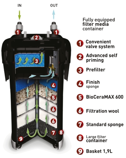 Беспрецедентная производительность: устройство отличается очень большой пропускной способностью (максимальные значения от 1000 до 2000 л/ч), благодаря чему они могут эффективно работать даже в очень больших аквариумах (объёмом до 700 л). Более того, они очень вместительны и содержат значительное количество фильтрующих наполнителей, помещённых в удобные, эргономичные корзинки объемом 1,9 л каждая (в зависимости от модели, количество корзинок составляет от 3 до 5). Благодаря этому они обеспечивают эффективную механическую и биологическую фильтрацию воды. В комплект входят наполнители, тщательно подобранные для нужд типичного аквариума.