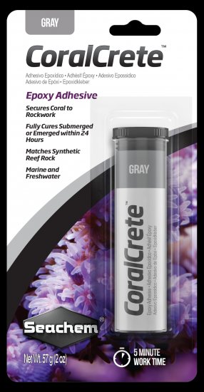 Seachem CoralCrete ™ - это двухкомпонентный эпоксидный клей, который можно использовать для крепления кораллов к камням или плашкам. Seachem CoralCrete ™ застывает в течение пяти минут. CoralCrete ™ безопасен для обитателей аквариума при использовании по назначению.