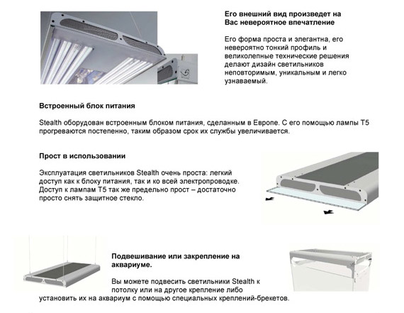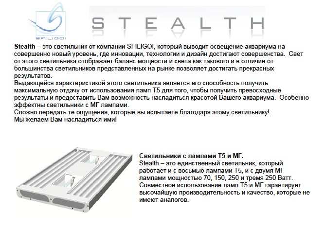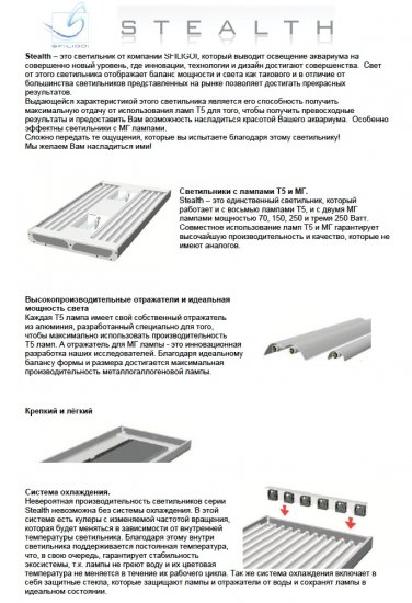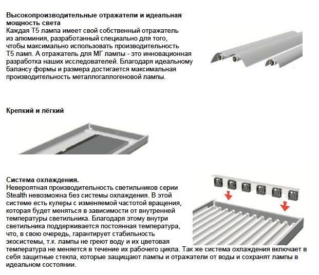 Подвесной светильник Stealth HQI DELTA 2x250W DE Fc2 8x54W имеет систему охлаждения и внешний ПРАРазмеры светильника: 123x50x7смДанный светильник подойдёт для многих морских и пресноводных аквариумов, требующих максимальной освещённости. Благодаря особой конструкции с высокой концентрацией ламп МГ+T5 нацеленной на увеличение максимальной освещённости мы получаем следующие ориентировочные размеры аквариумов:по длине от 120см до 150смпо ширине от 50см до 70смпо высоте от 50см до 100см